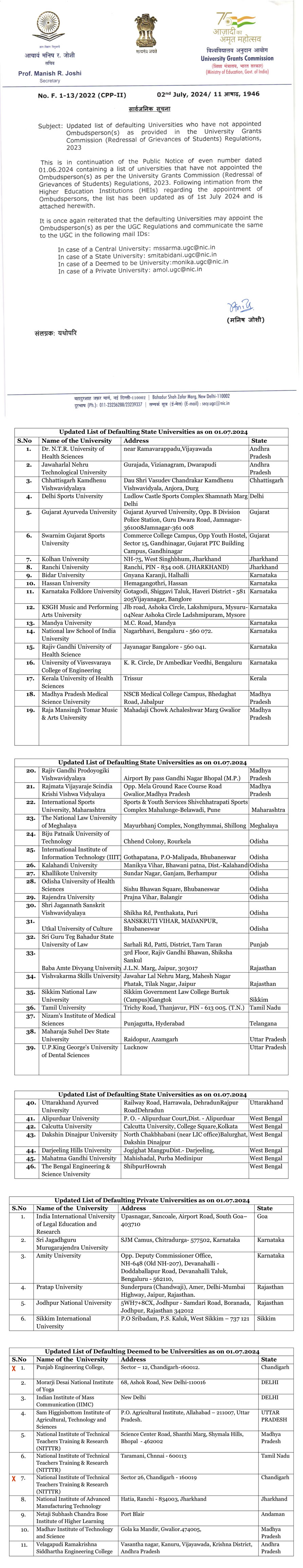 New Delhi, July 2, 2024 — The University Grants Commission (UGC) India has issued a Public Notice, presenting the “Updated List” of Defaulting Universities that have not yet appointed Ombudsperson(s) as required by the University Grants Commission (Redressal of Grievances of Students) Regulations, 2023.