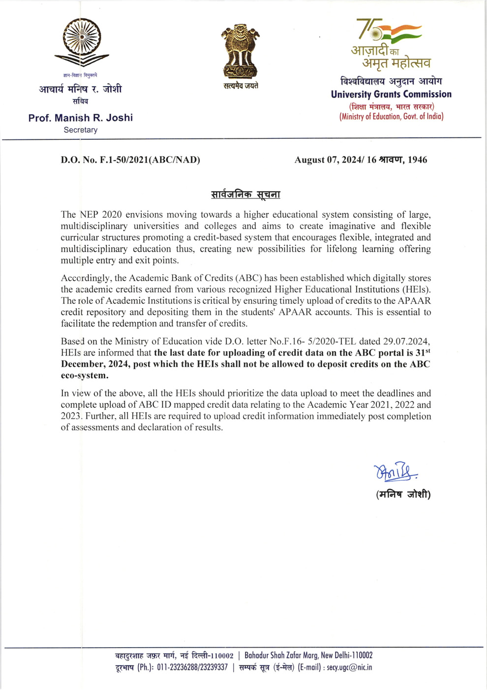 - The University Grants Commission (UGC) has issued a public notice establishing the Deadline for higher education institutions to upload credit data to the ABC portal.