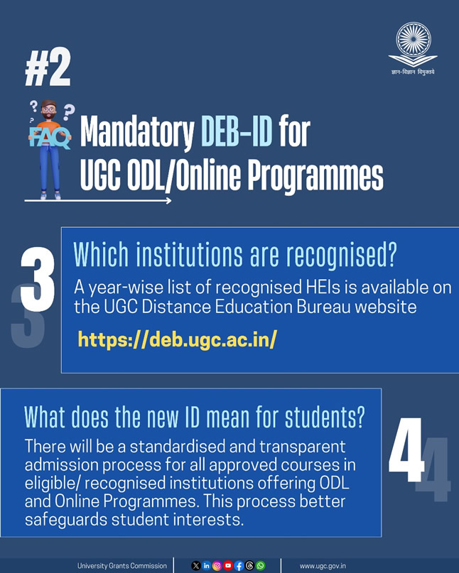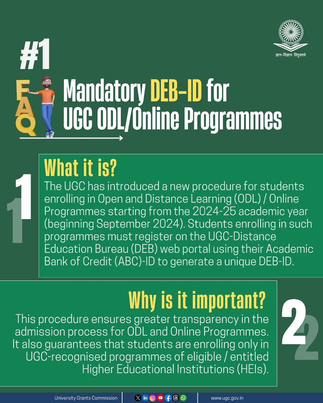 Starting from the academic year 2024-25, students (except for foreign learners) enrolling in ODL/Online programs at recognized/entitled HEIs must create a DEB-ID. Once generated on the UGC-DEB web portal, the DEB-ID will remain valid for lifelong ODL/Online learning.