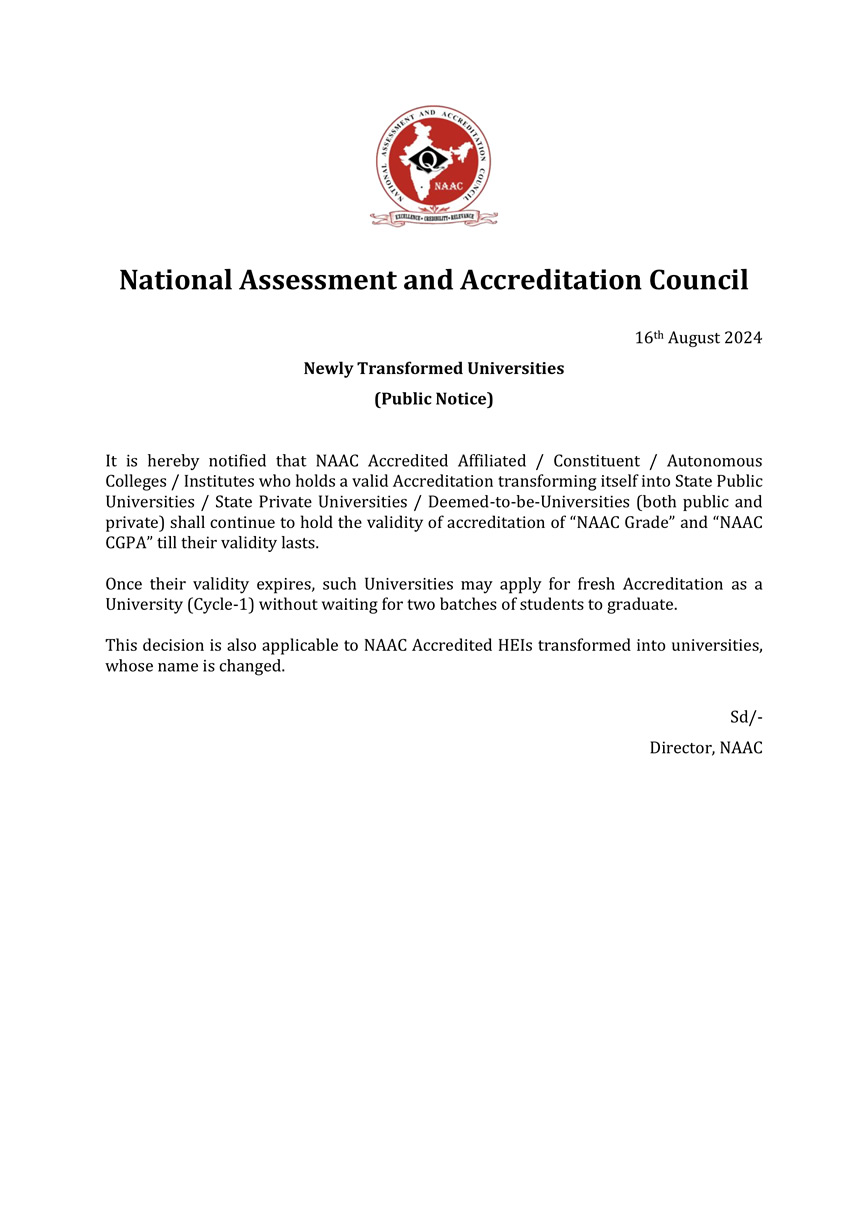 - The National Assessment and Accreditation Council (NAAC) in India has issued a public notice concerning Newly Transformed Universities.