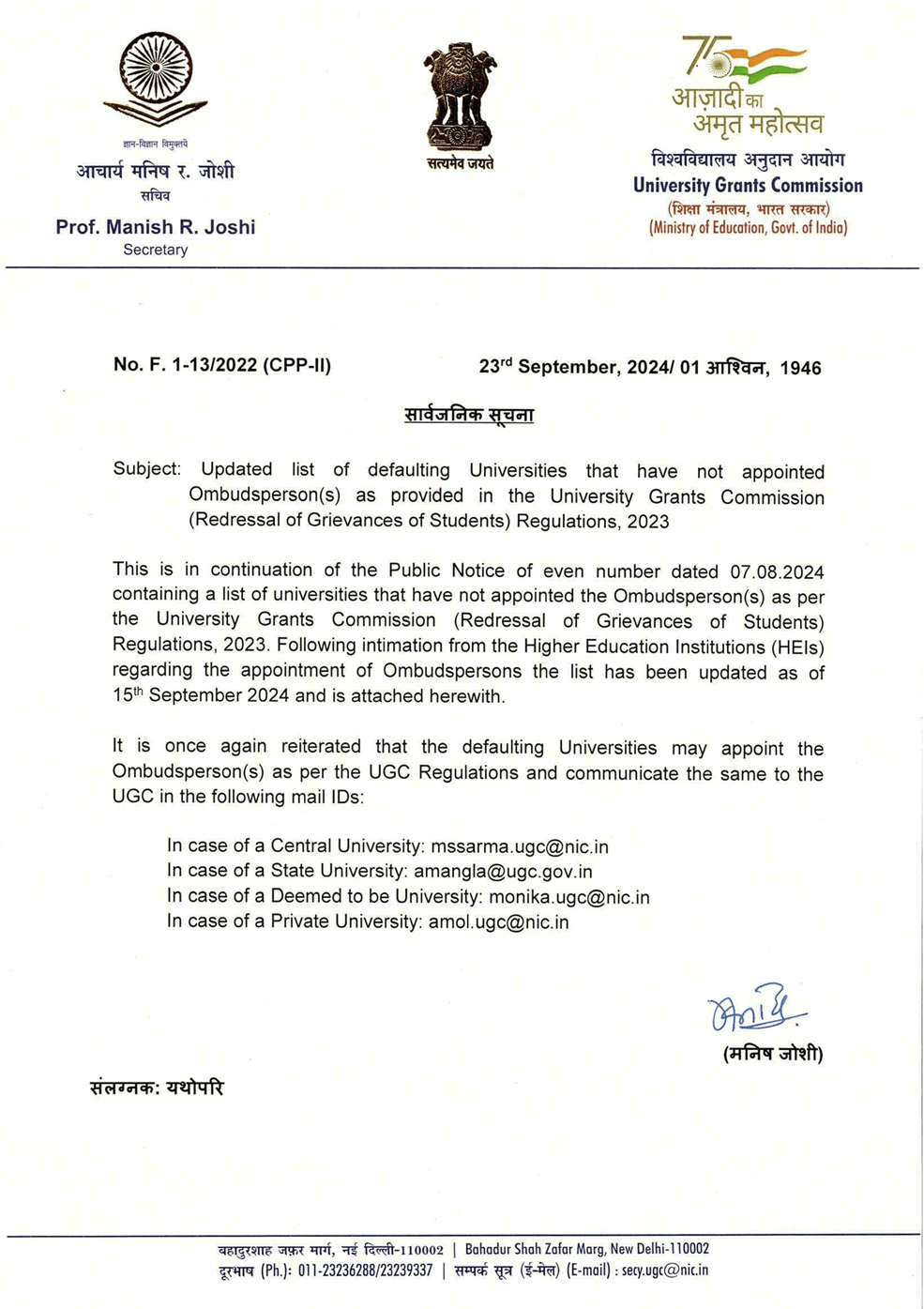 New Delhi / Chandigarh, India, October 03, 2024: The University Grants Commission (UGC) in India has published the “Updated List” of “Defaulting Universities” that have failed to appoint Ombudsperson(s) as mandated by the University Grants Commission (Redressal of Grievances of Students) Regulations, 2023.