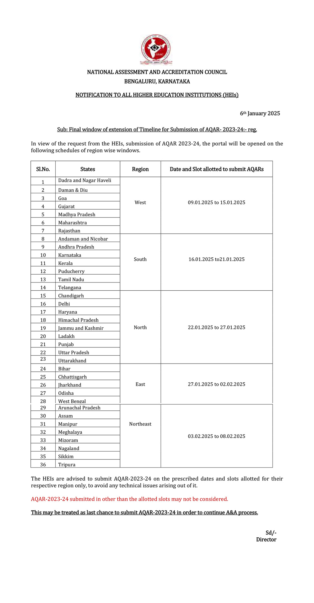 Bangalore, India, January 9, 2025 — The National Assessment and Accreditation Council (NAAC) has issued a notification to all higher education institutions (HEIs) in India concerning the final extension for submitting the Annual Quality Assurance Report (AQAR) for the academic year 2023-24.