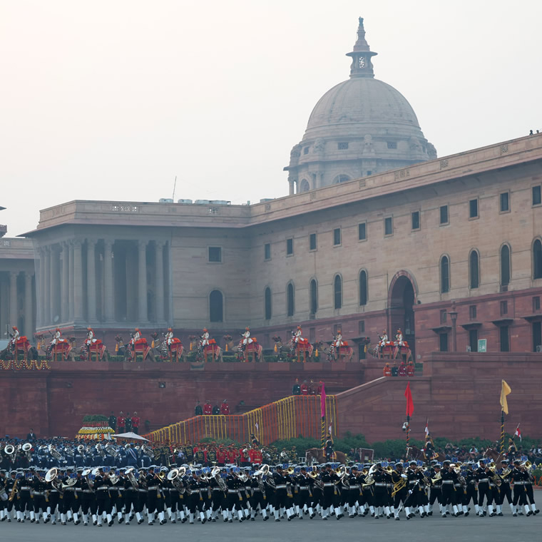 The bands of the Indian Army (IA), Indian Navy (IN), Indian Air Force (IAF), and Central Armed Police Forces (CAPF) performed 30 lively Indian tunes in front of a distinguished audience. Attendees included President Smt. Droupadi Murmu, Vice-President Shri Jagdeep Dhankhar, Prime Minister Shri Narendra Modi, Raksha Mantri Shri Rajnath Singh, along with other Union Ministers, senior officials, and members of the public.