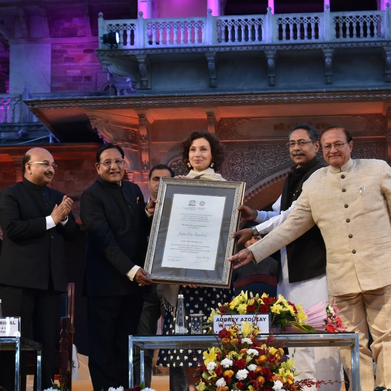 In 2020, Ms. Audrey Azoulay, the Director-General of UNESCO, awarded the UNESCO World Heritage City certificate to Jaipur, the “Pink City” at Albert Hall, Jaipur, Rajasthan, India.