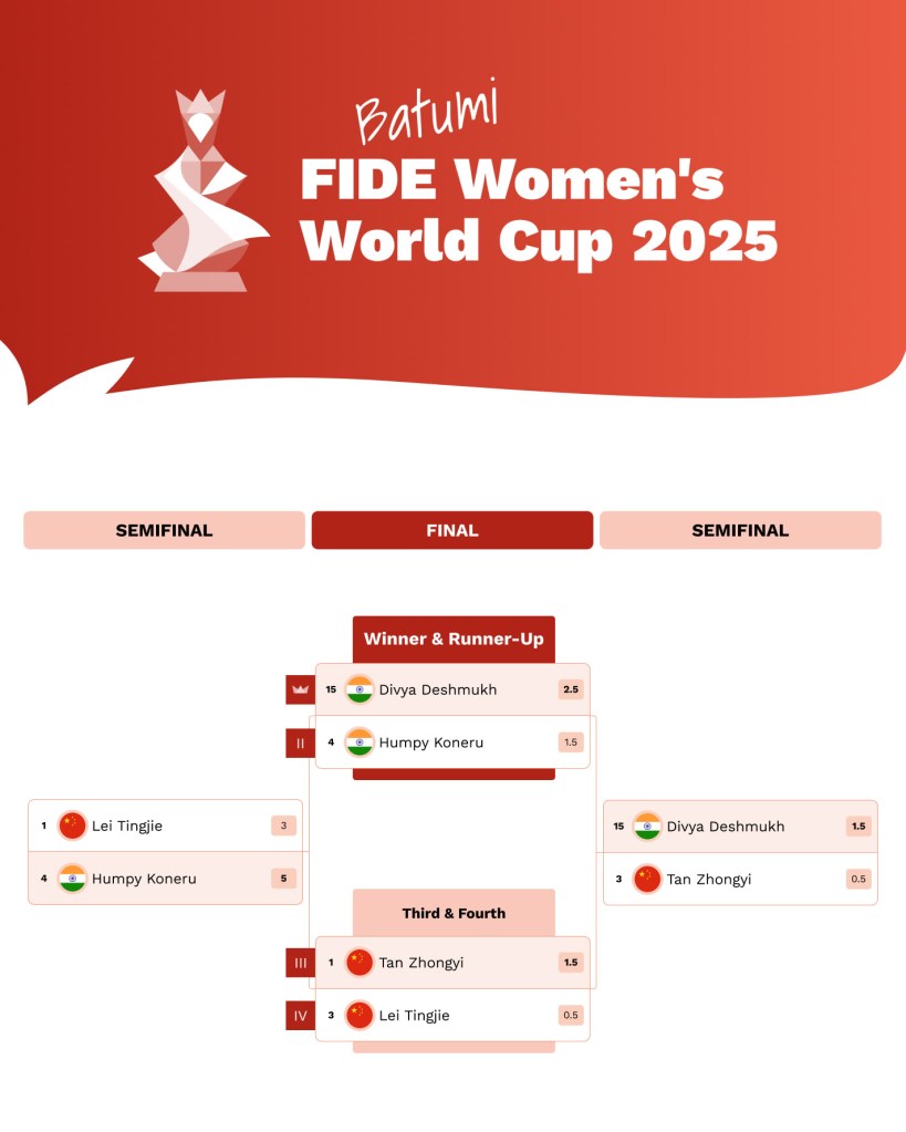 After two intense days of classical chess, where both players fought valiantly but ended in draws, the fate of the championship was decided in an electrifying tie-breaker round. In the first rapid tie-breaker, both competitors fought hard, resulting in another draw. However, in the second rapid tie-breaker, Divya displayed remarkable composure and strategic brilliance, ultimately triumphing over Humpy with the black pieces.
