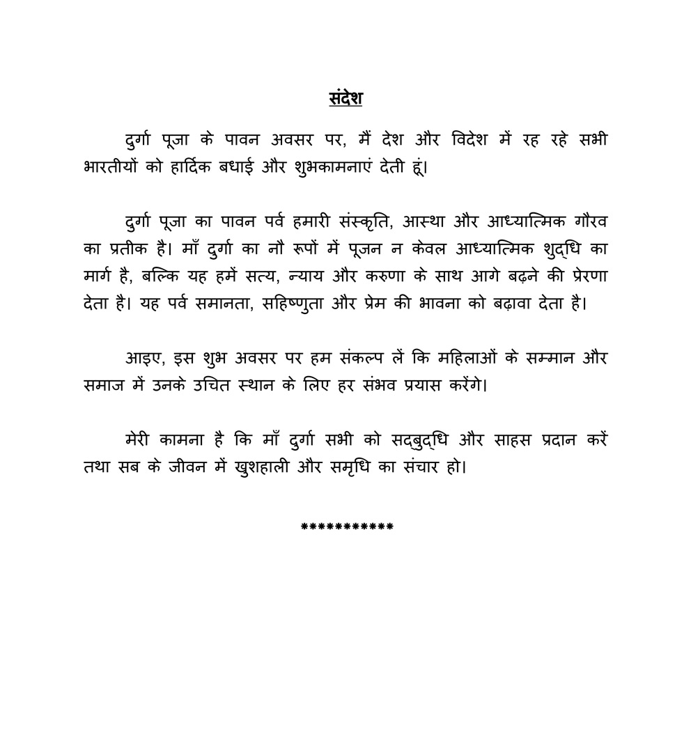 On this auspicious occasion, let us pledge to make every possible effort to ensure respect for women and to uphold their rightful place in society. I pray to Maa Durga to bestow wisdom and courage upon everyone and to bless all with happiness and prosperity.”