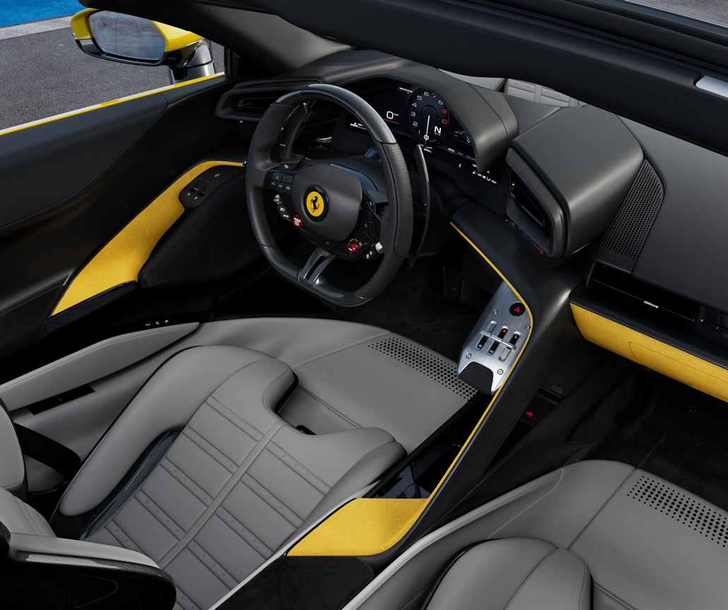 The car is both an authentic coupé and an actual spider, thanks to Ferrari’s retractable hard top (RHT). This feature allows the driver to open and close the roof in just 14 seconds, even while driving at speeds of up to 45 km/h. It means that the car’s exceptional performance can be enjoyed in any conditions, even outdoors, enhancing the connection with the surroundings and intensifying the driving experience. To maximize comfort, a new system has been developed to minimize turbulence inside the cabin, featuring an innovative wind catcher positioned behind the seats.