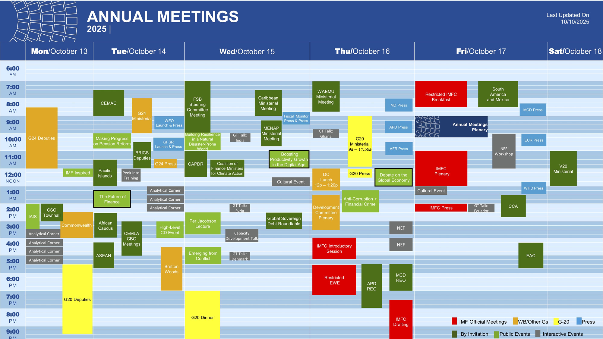 Each year, both the Annual and Spring Meetings of the IMF and the World Bank Group bring together central bankers, finance ministers, development officials, private sector executives, civil society representatives, and academics. They discuss the state of the global economy and address international issues such as growth outlook, financial stability, and poverty reduction.