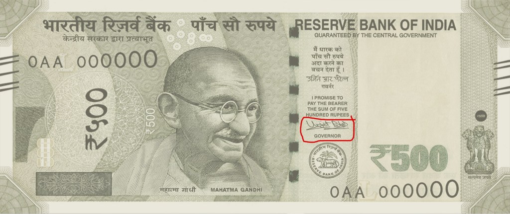 The Governor of the Reserve Bank of India officially signs the Indian Rupee banknotes.