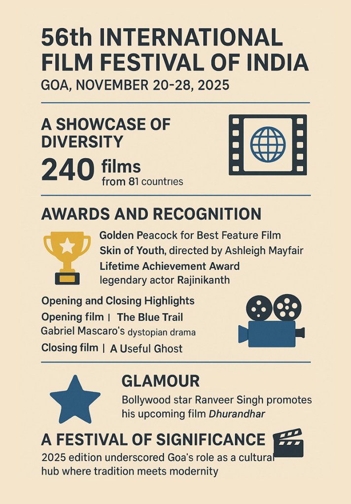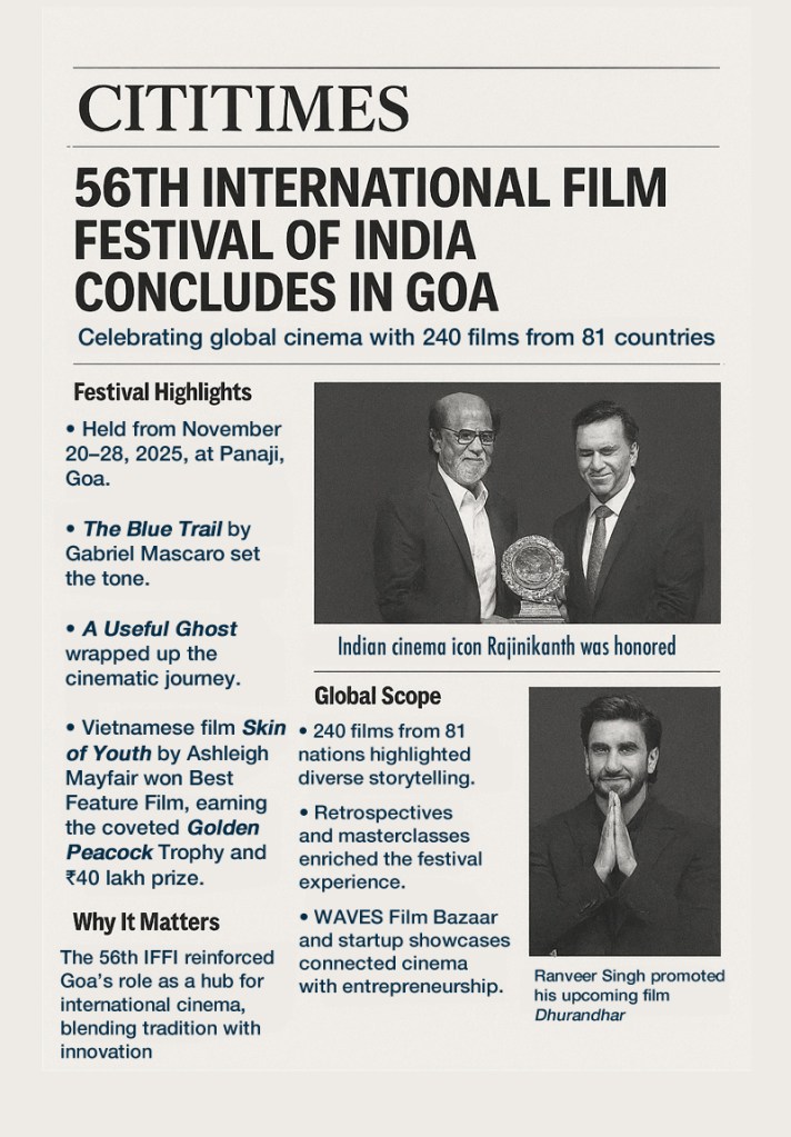 The curtains have drawn on the 56th International Film Festival of India (IFFI), held in Panaji, Goa, from November 20–28, 2025. Over eight days, the festival reaffirmed its stature as one of Asia’s premier cinematic gatherings, bringing together filmmakers, artists, and audiences from across the globe.