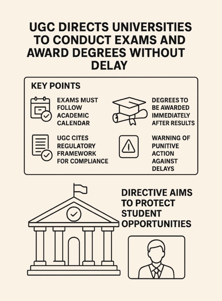 In its communication, the UGC emphasized that examinations must be held strictly in accordance with the academic calendar and that degrees should be conferred shortly after the results are declared. The Commission cited its regulations, including the UGC (Minimum Standards and Procedure for Award of Degrees) Regulations, which mandate the timely execution of these processes.
