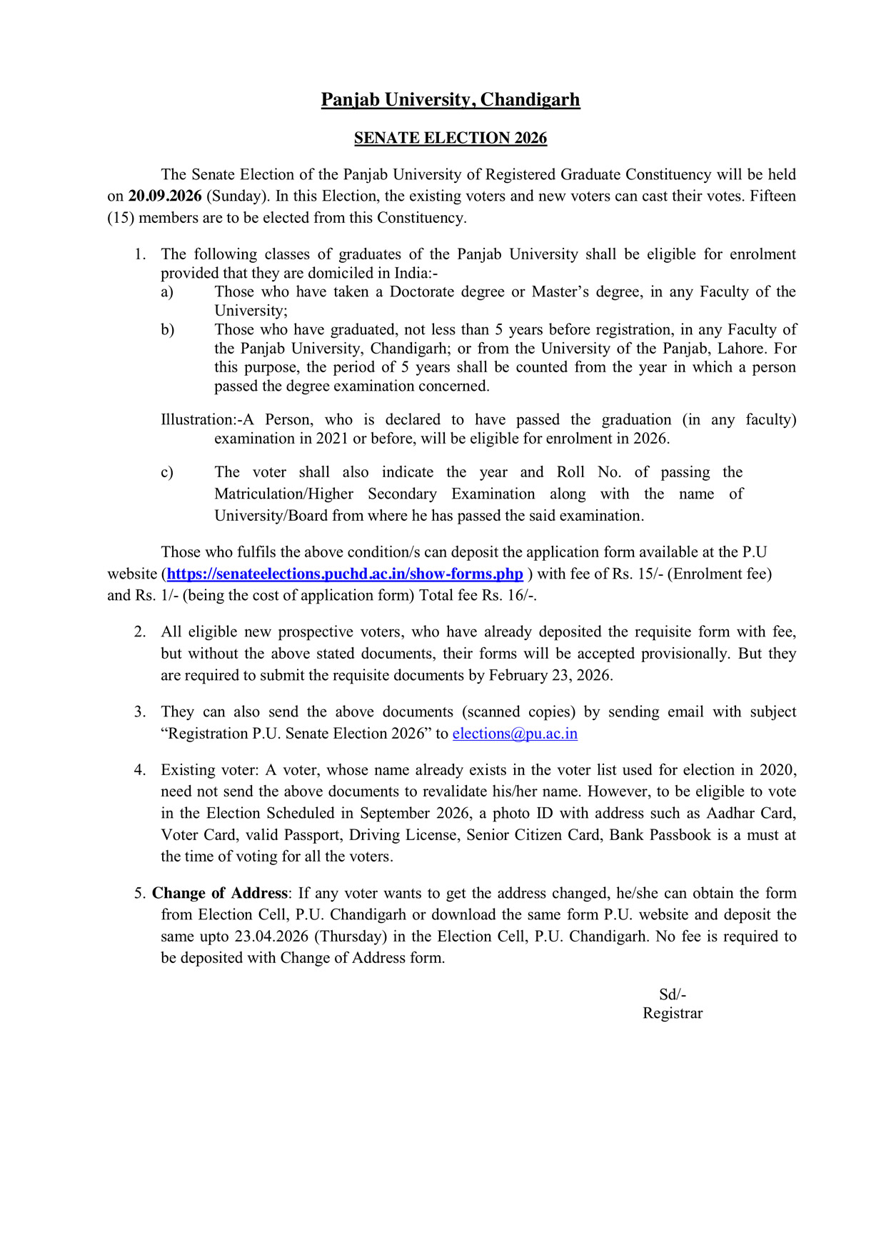 Panjab University Registrar has now issued a ‘Senate Election 2026’ notice clarifying Eligibility Conditions for enrolment in the Registered Graduates Constituency for the 2026 Senate Elections. The notice reiterates that: