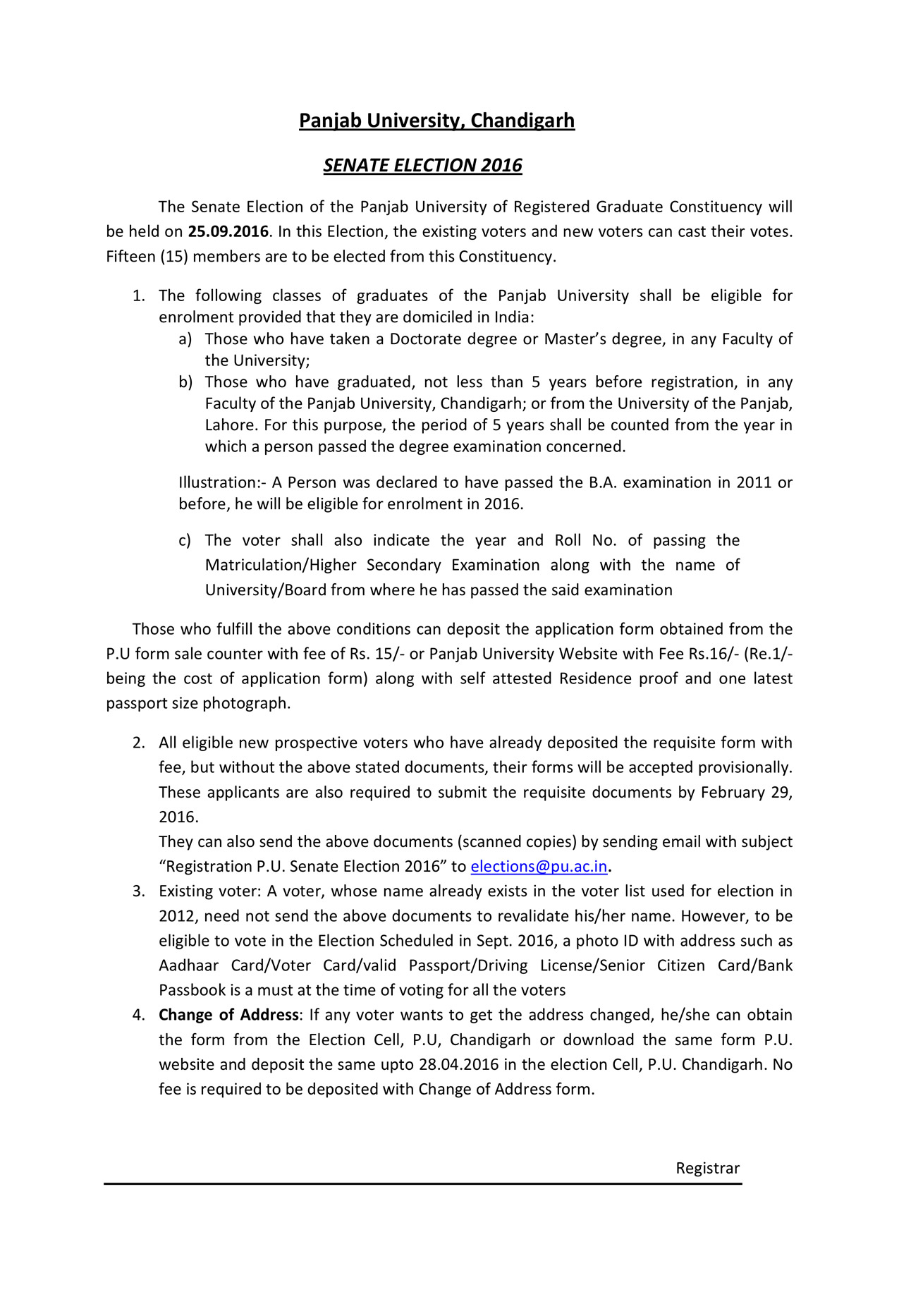 The deadline for fresh enrolment as a Registered Graduate is February 23, 2026, and the nominal registration fee is ₹15. Application forms and supporting documents are available through the official PU Senate Elections portal.