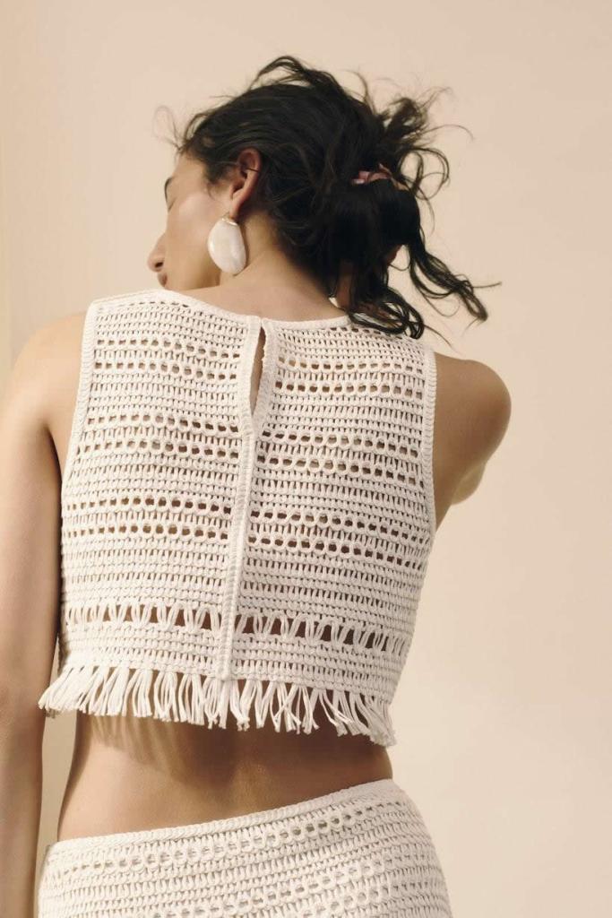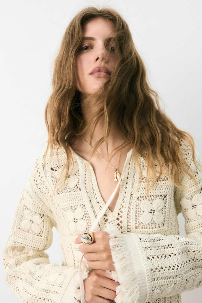 One of the collection’s most compelling threads is its emphasis on texture and craftsmanship. Opulent embroidery and bold crochet detailing bring tactility to the forefront—seen in fringed tops, sheer gowns, and intricately worked blouses.